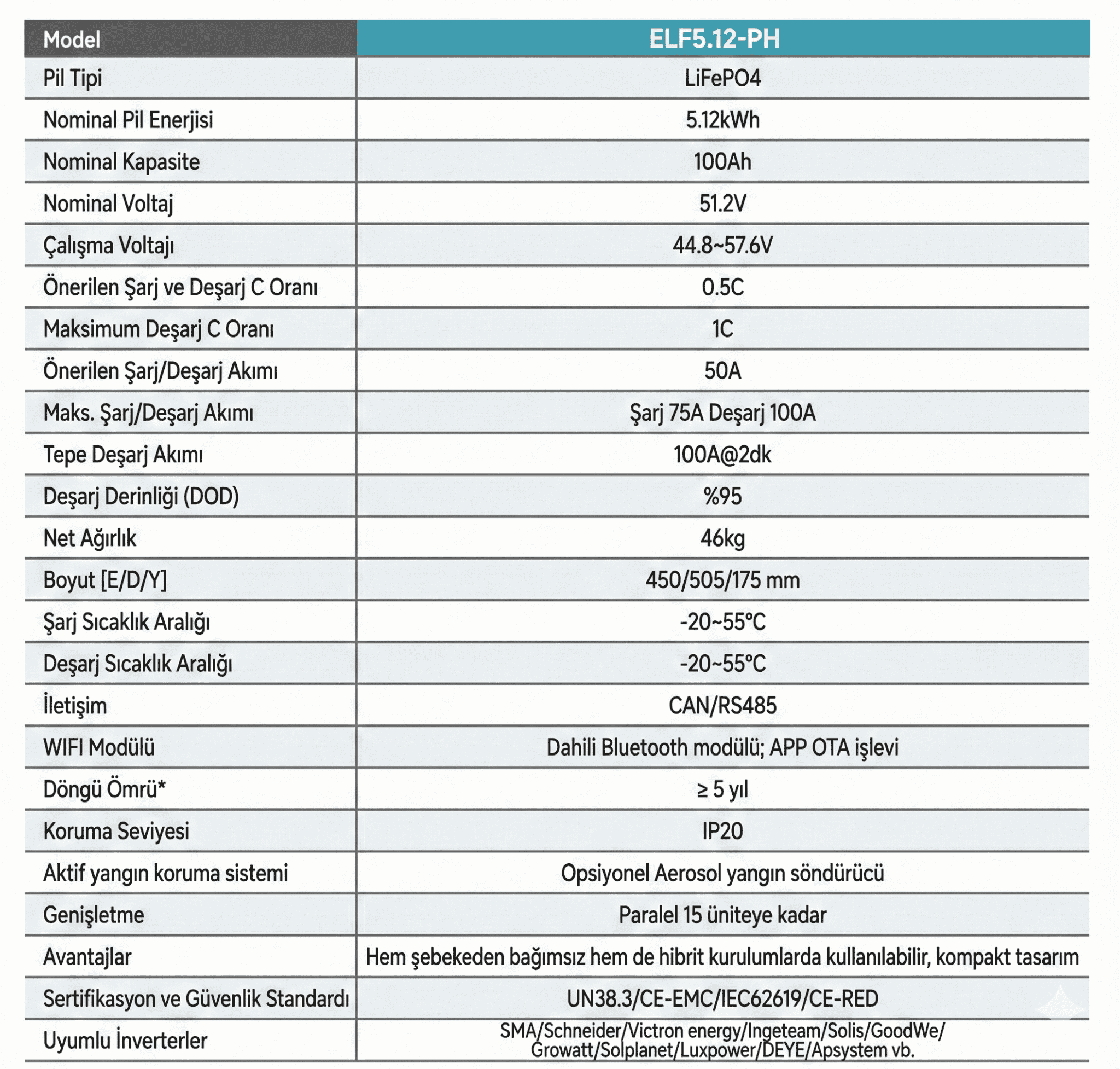 • 51.2V nominal gerilim ve 100Ah kapasite ile 5.12 kWh enerji depolama