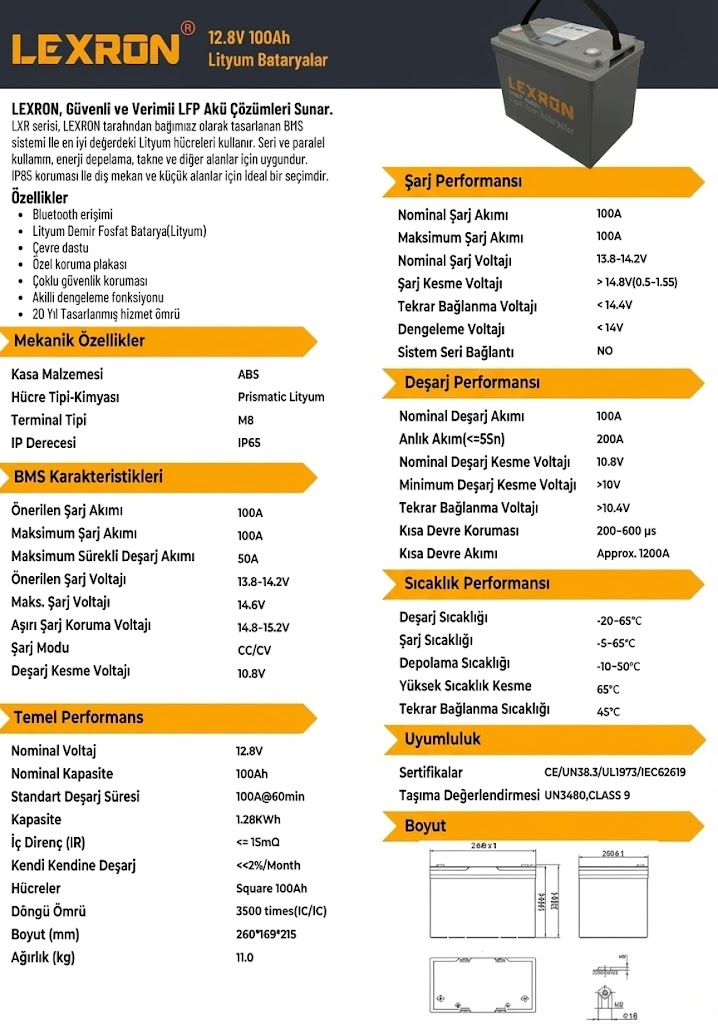 Lexron 12.8V 100Ah LiFePO₄ (Lityum Demir Fosfat) akü; güneş enerjisi sistemleri, karavanlar, tekneler ve off-grid uygulamalar için geliştirilmiş, yüksek güvenlikli ve uzun ömürlü bir enerji depolama çözümüdür. Gelişmiş BMS sistemi sayesinde hücreleri sürekli izler, dengeler ve sisteminizi aşırı şarj, aşırı deşarj ve kısa devreye karşı korur.
