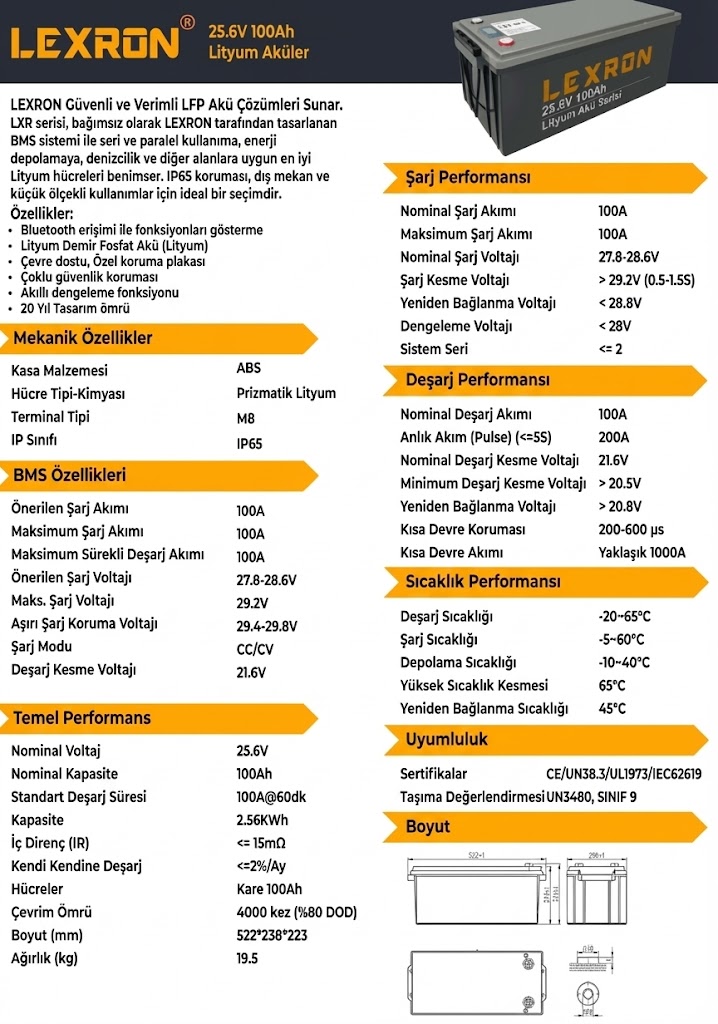 Lexron 25.6V 100Ah LiFePO₄ (Lityum Demir Fosfat) akü; 24V sınıfı solar enerji sistemleri, karavan/tekne uygulamaları, UPS ve yedek enerji ihtiyaçları için geliştirilmiş güvenli ve uzun ömürlü bir depolama çözümüdür. Dahili BMS; hücreleri izler, dengeler ve sistemi aşırı şarj/aşırı deşarj, aşırı akım ve kısa devre gibi risklere karşı korur.