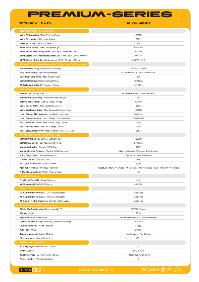 Mexxsun Premium 12 kW 48V Mppt Akıllı İnverter (Paralel /Wi-Fi/ Dual Output)