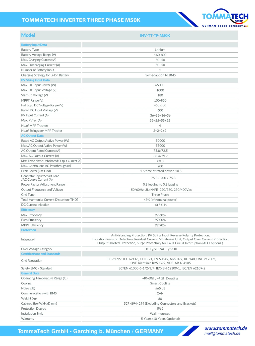 TommaTech 50 kW Üç Faz Hibrit İnverter, orta ve büyük ölçekli enerji projeleri için yüksek verimli ve güvenilir bir çözümdür. Gelişmiş MPPT teknolojisi, güçlü batarya uyumluluğu ve esnek paralel çalışma desteğiyle ticari ve endüstriyel uygulamalarda kesintisiz enerji yönetimi sağlar. IP65 koruma sınıfı ile dış mekâna uygundur.