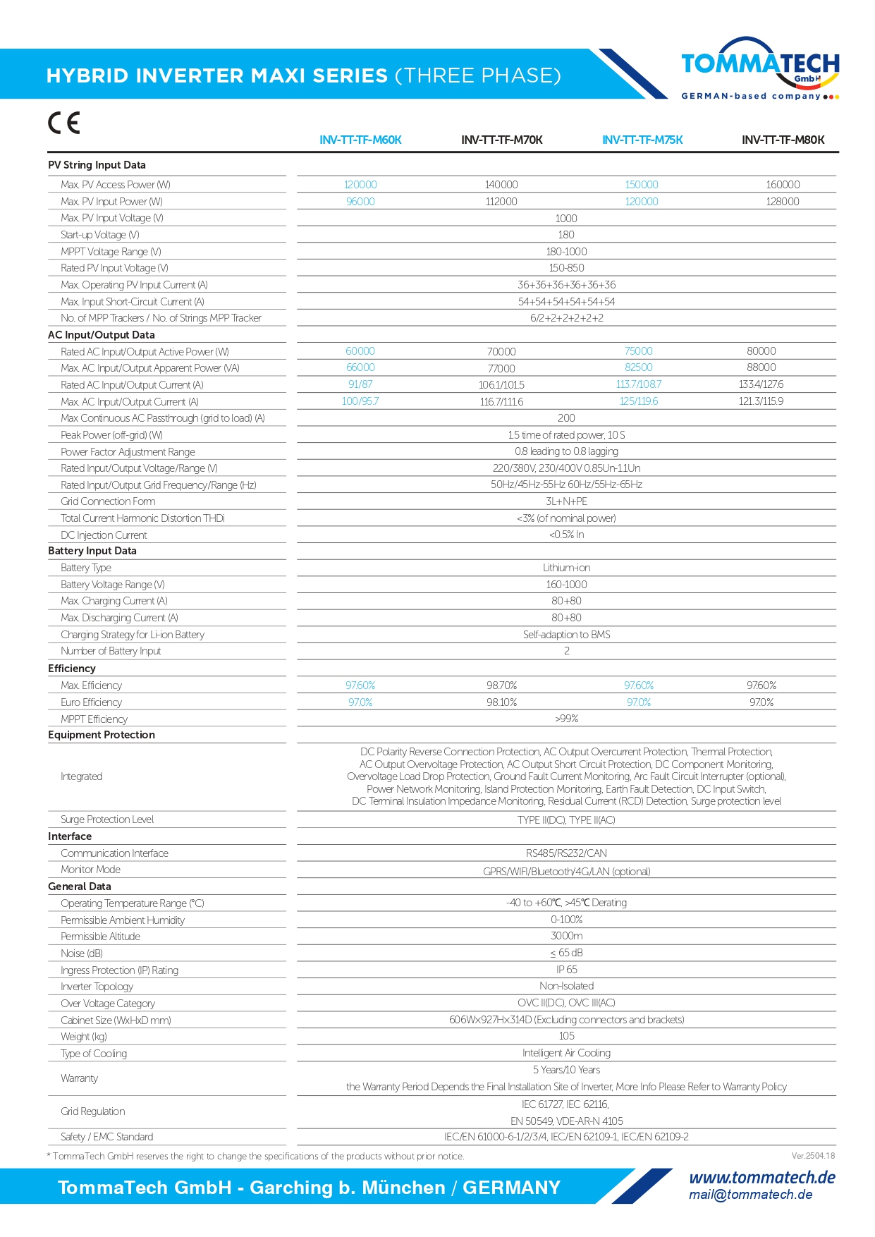 TommaTech Maxi Serisi 80 kW Hibrit İnverter, 5+5 yıl garanti seçeneğiyle sunulur. Alman mühendisliği ve yüksek kalite standartları sayesinde uzun ömürlü, güvenilir ve sürdürülebilir bir enerji çözümüdür.